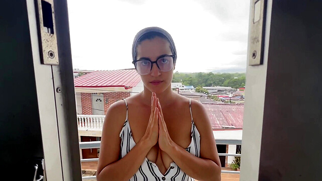 The college girl offers herself to the professor and fucks him in his apartment room while her girlfriend is in a yoga class.