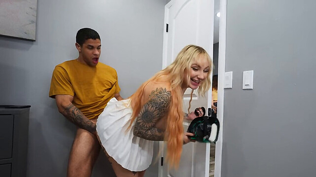 Nasty tall blonde orgasms strong on riding lad big black cock