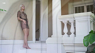 Amazing blonde Rika Fane plays with her pussy outside