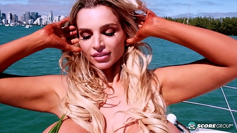 Light-haired Rachel Solari shows off her big boobs during a wild couch session